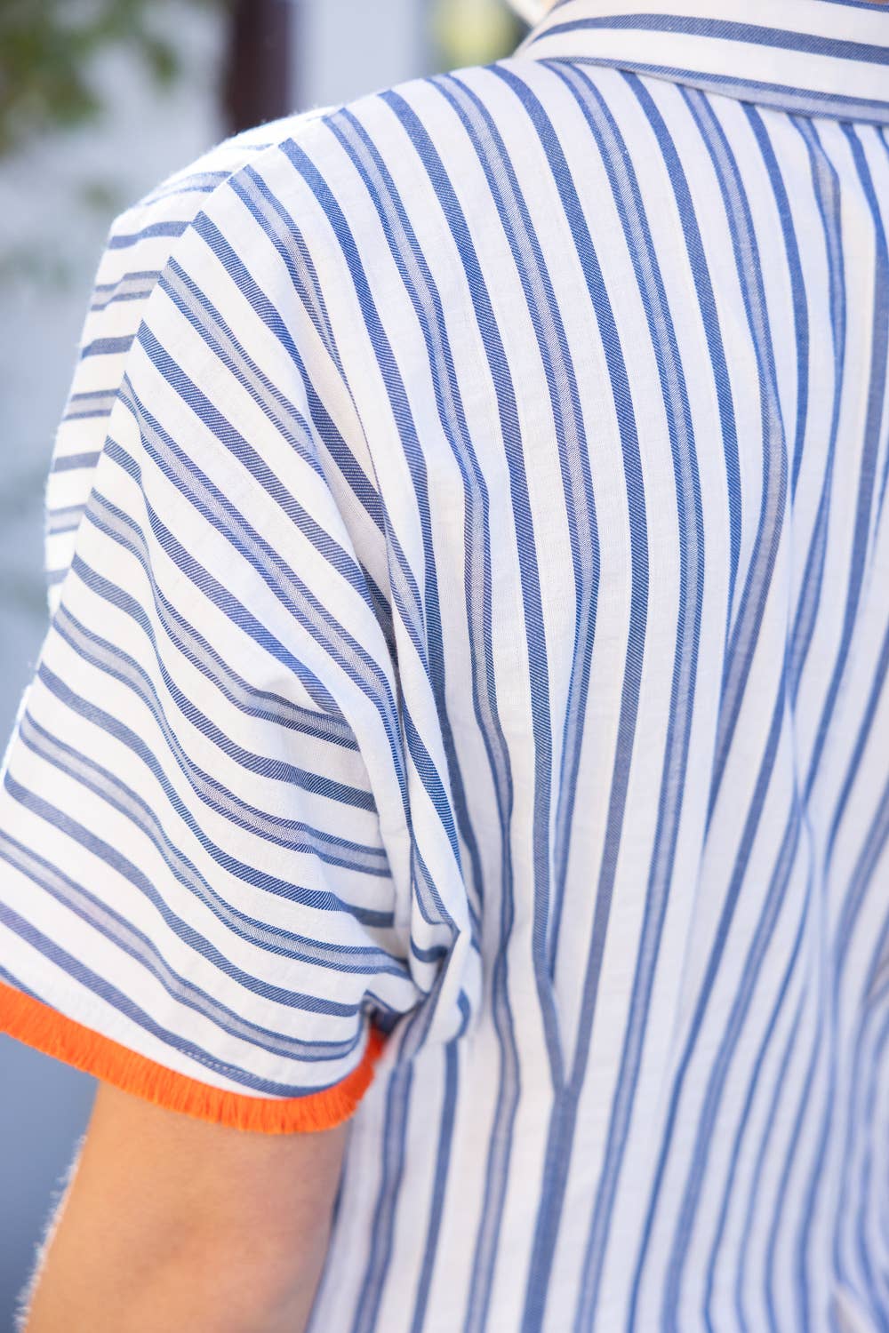 A breezy striped shirt dress with a timeless silhouette and easy fit. Designed with a collared neckline, button-front detail, and short sleeves finished with delicate fringe trim, this lightweight style brings effortless polish to warm-weather boutique collections