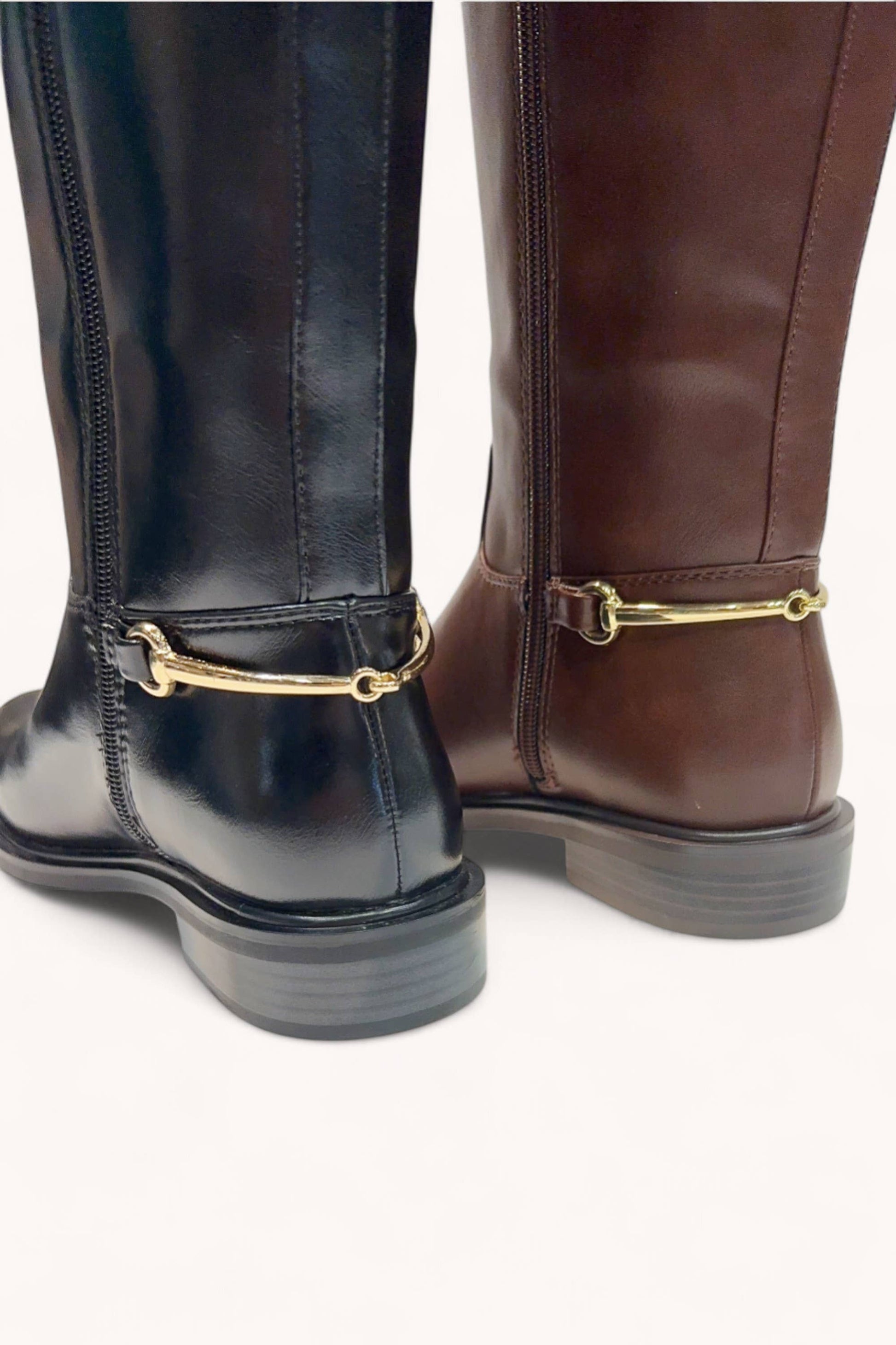 These classy tall riding boots feature a refined design enhanced by a golden horsebit detail on a strap around the back of the ankle, adding a touch of equestrian elegance. With a timeless silhouette, these boots are a versatile and stylish choice for various occasions, providing both comfort and sophisticated flair.