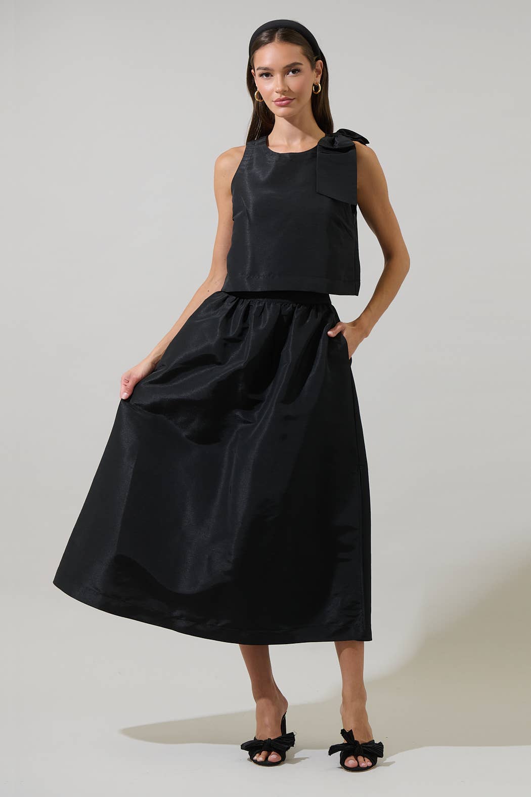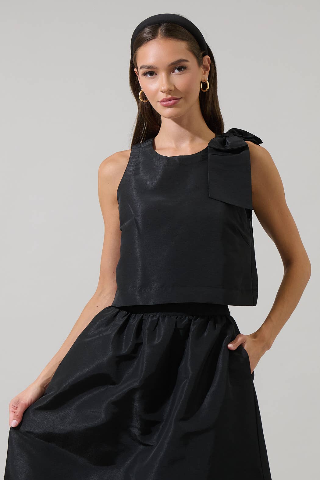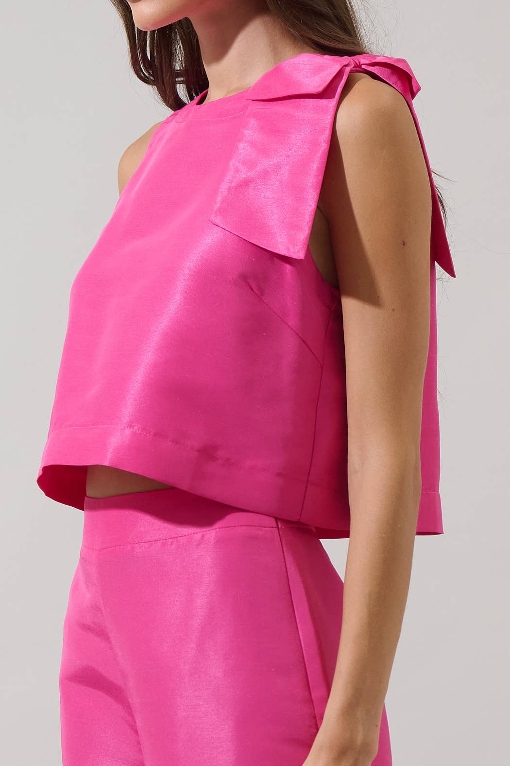 Sweet meets sophisticated in this chic sleeveless top. Featuring a round neckline, keyhole back, and bow detail at the shoulder, it pairs perfectly with the matching bottom. Finish the look with dainty heels and a mini bag.