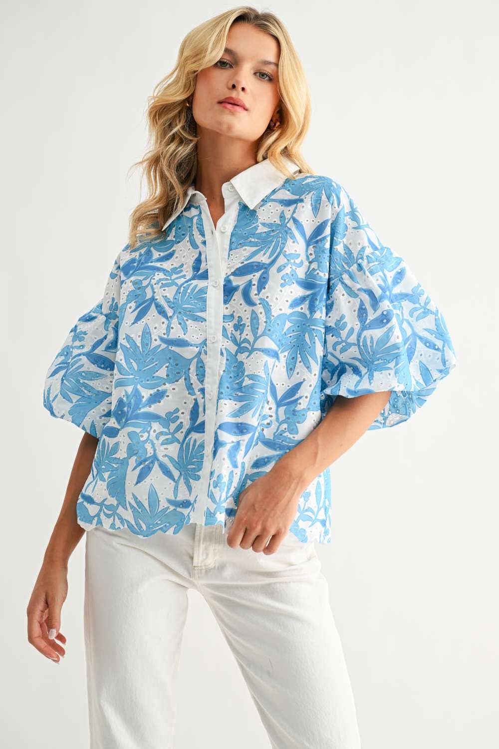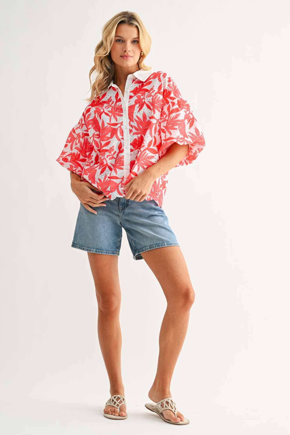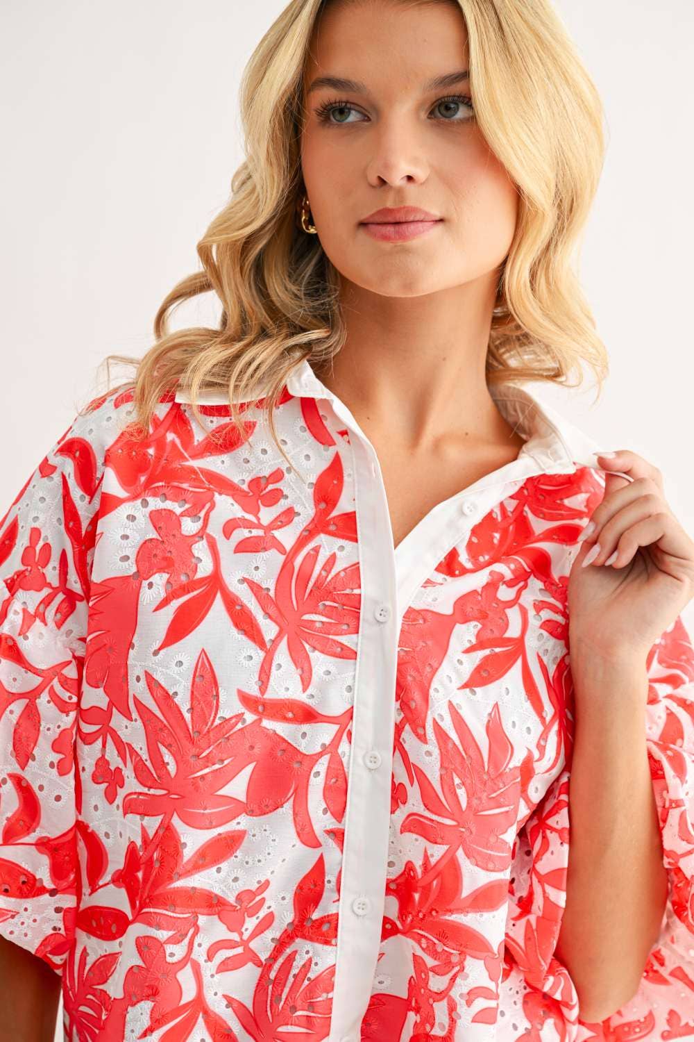 The Jinny Top is a vibrant button-up top that features a bold coral floral print on airy eyelet fabric, balanced with a crisp white collar and placket. Its relaxed, flowy silhouette offers effortless comfort while making a stylish statement—perfect for warm, sunny days.