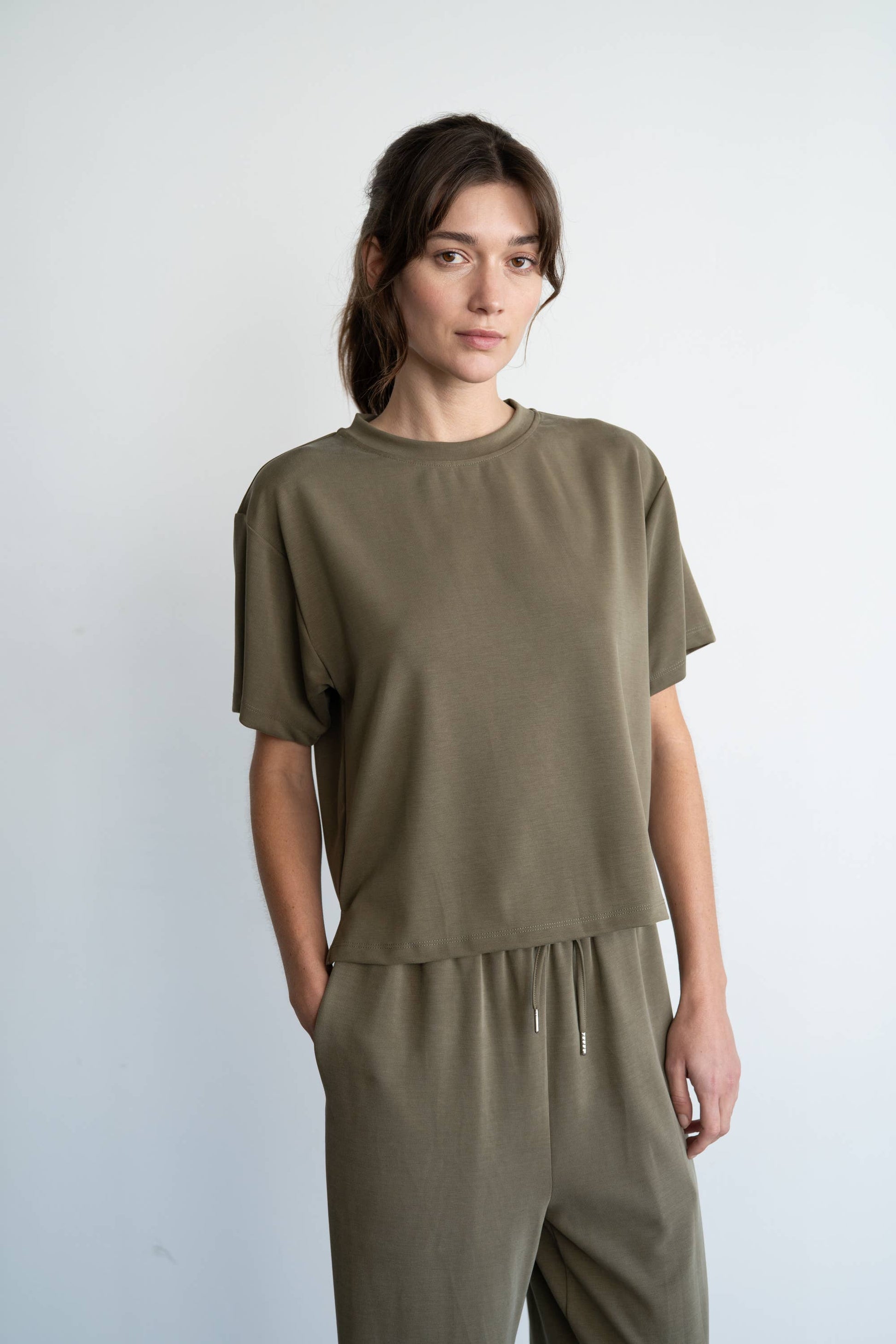 - Relaxed crew neck silhouette with short sleeves