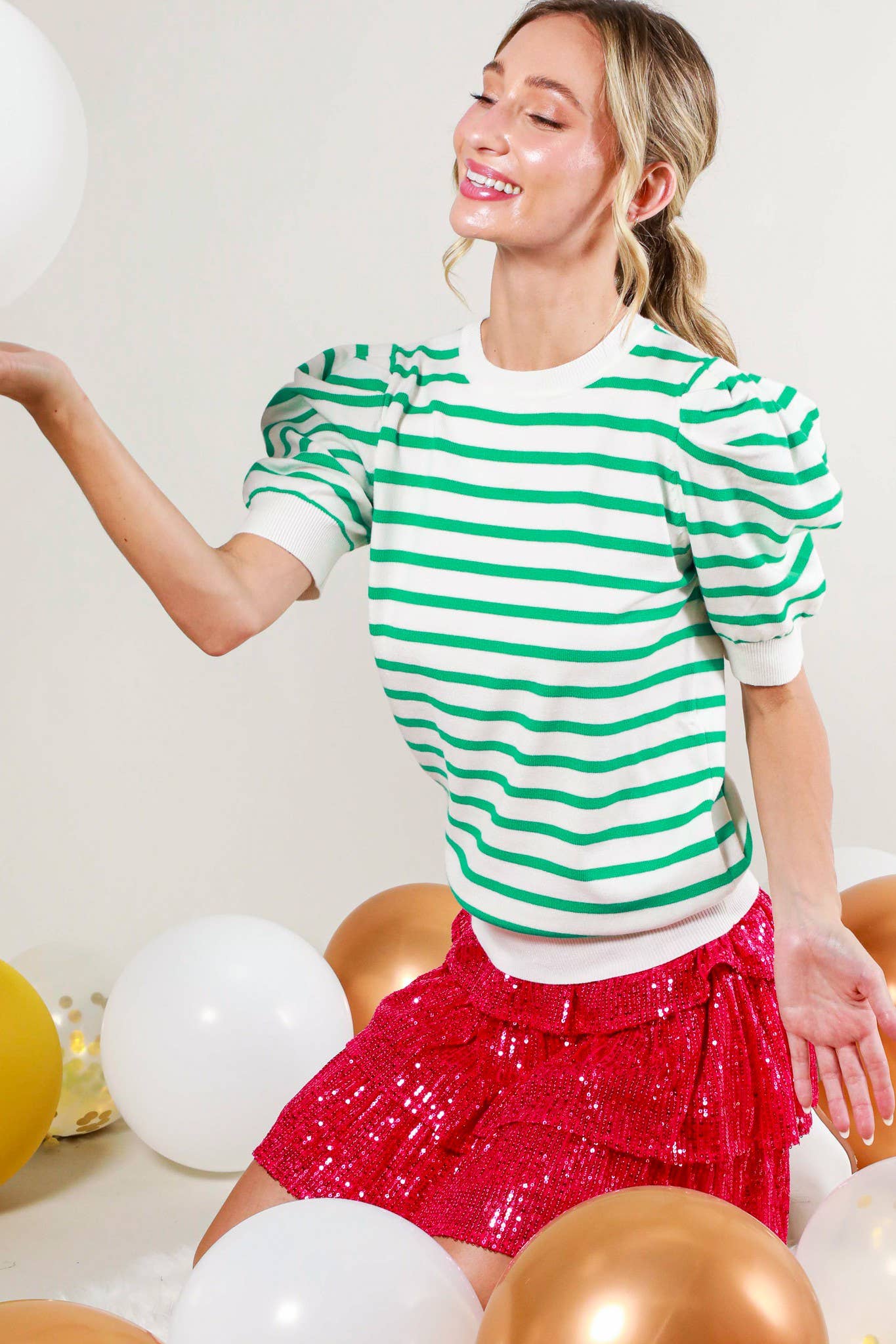 Striped Crew Neck Puff Sleeve Knitted Sweater VT81344A
