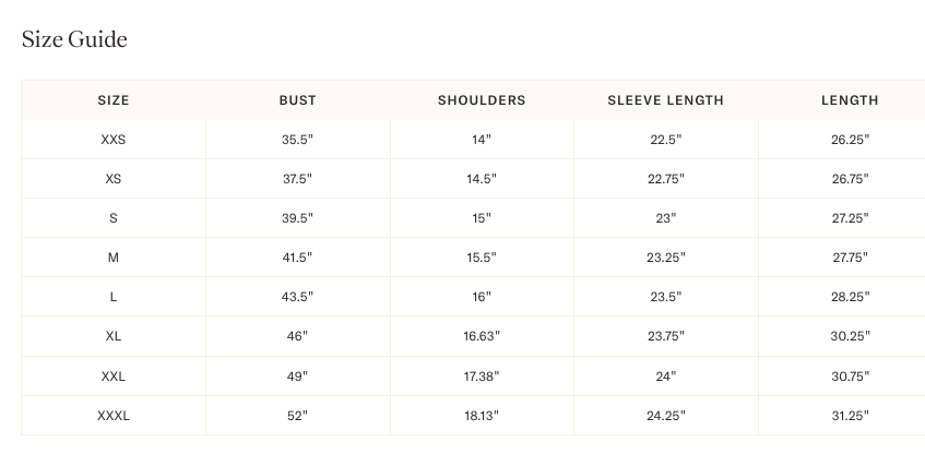 **Sizing reference