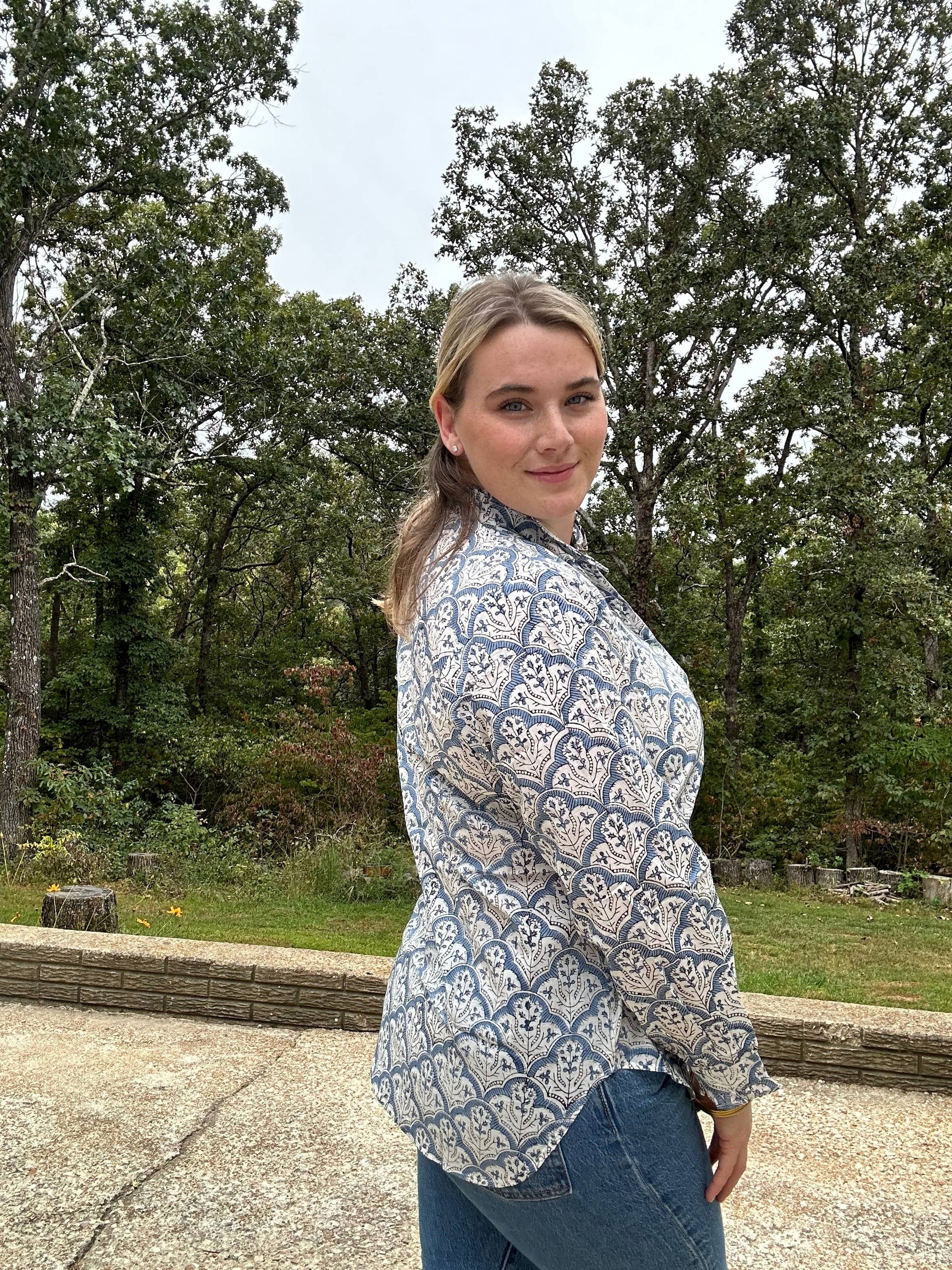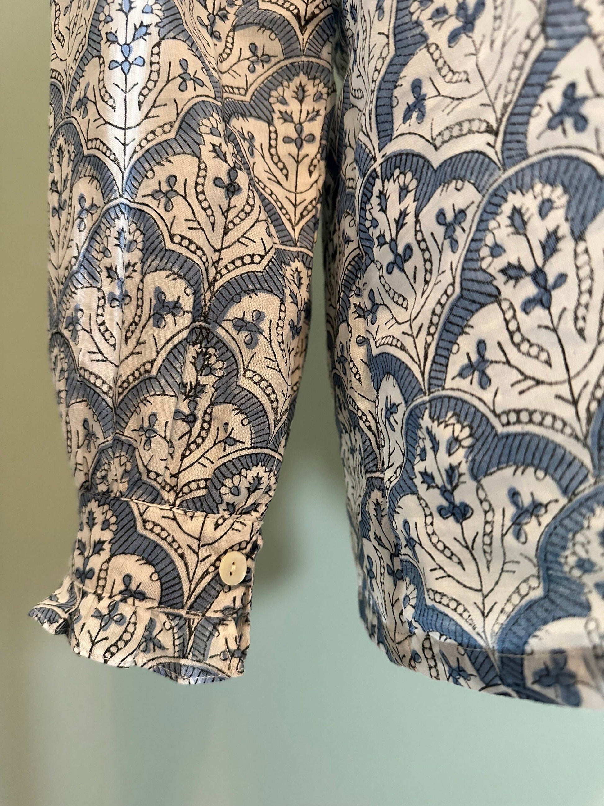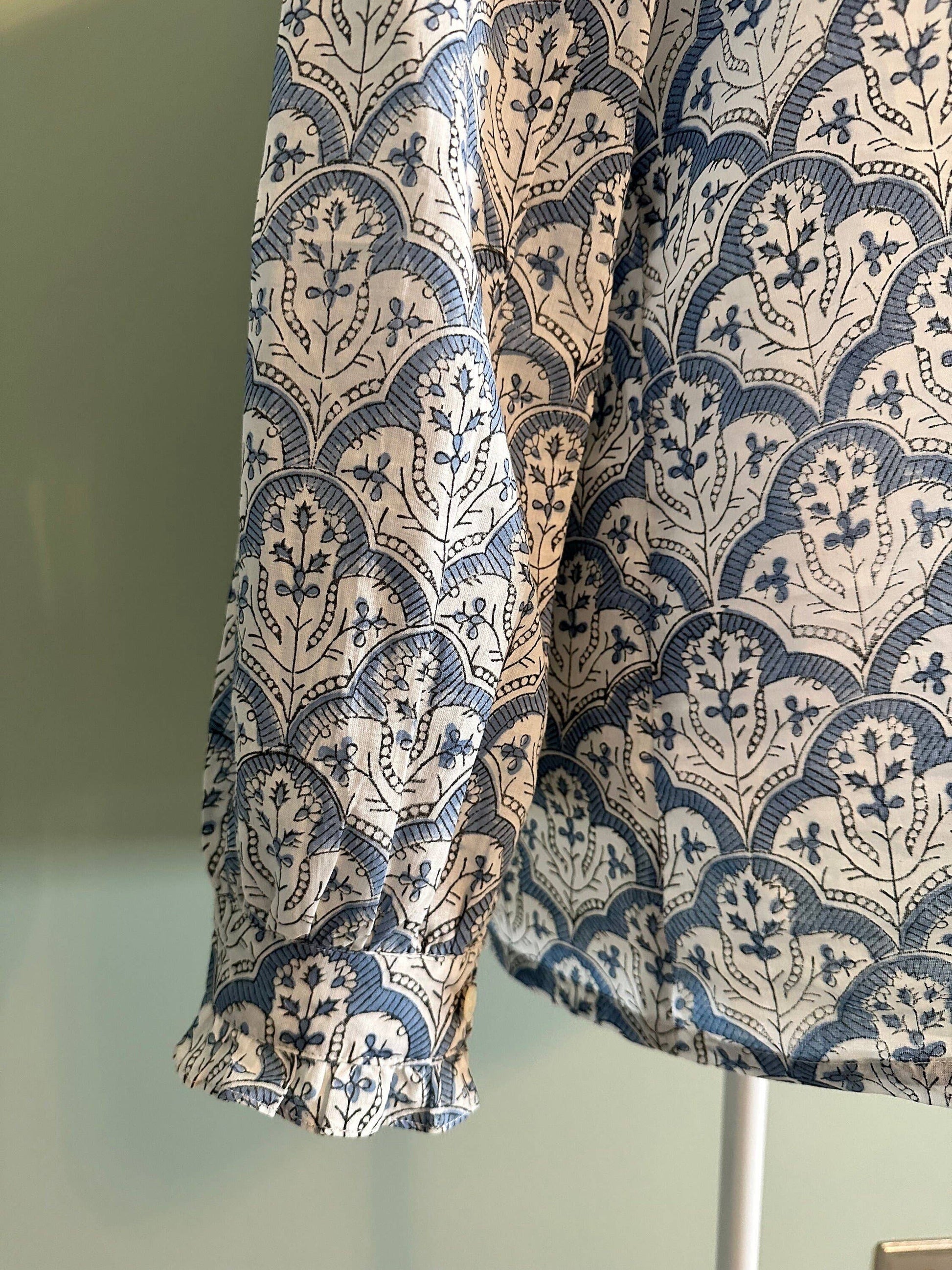 This beautiful button up block print blouse is made of 100% cotton and lightweight. A handmade block print featuring blue, white, and a touch of black. This limited, unique shirt is only available while stock last!With a unique ruffled collar as well as ruffled sleeves, it would look stunning tucked into jeans layered with a sweater giving the gorgeous collar the attention it deserves. A great piece to dress up from night to day.