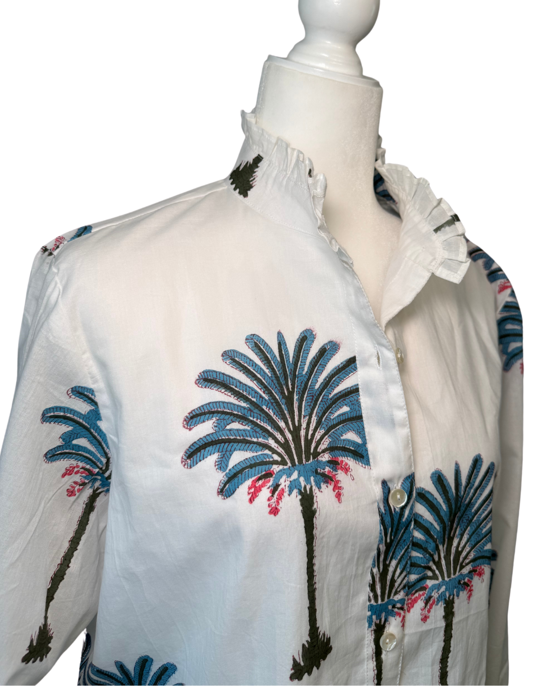 This beautiful button up block print blouse is made of 100% cotton and lightweight. A handmade block print featuring a pink and blue palm tree print. This limited, unique shirt is only available while stock last!