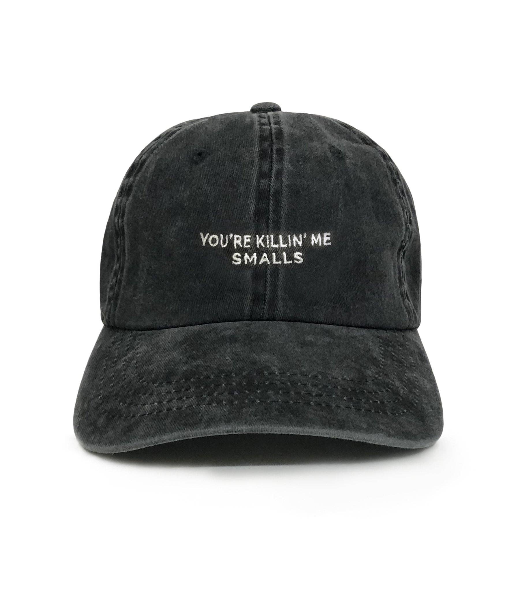 • washed black 6-panel dad hat • 100% cotton • adjustable strap • embroidered "You're Killin' Me Smalls" text • ships worldwide